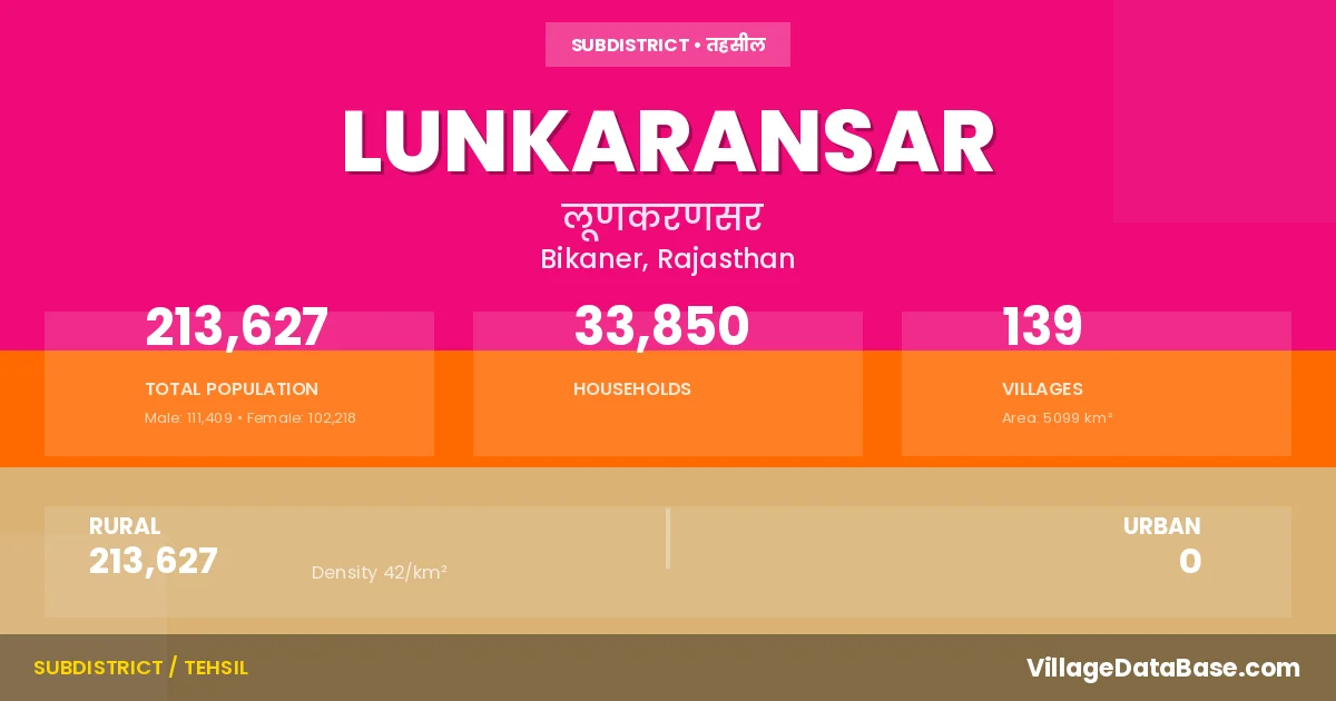 According to the 2011 census The total area of Lunkaransar Tehsil is 5099 km², with a population of 213627 people. The population density is 42 inhabitants per square kilometre, and there are approximately 33850 houses in the sub district.