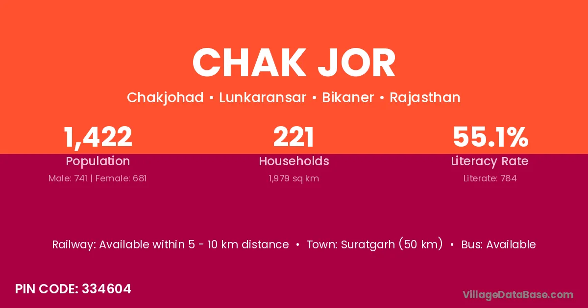 Suratgarh (50 km) is the nearest town to Chak Jor village for major economic activities and is located approximately 50 km away.