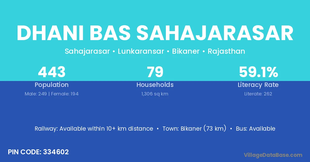 Dhani Bas Sahajarasar village has a total population of 443 people, of which 249 are males and 194 are females.