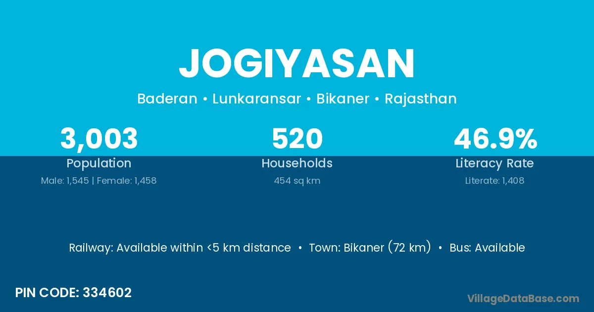 Bikaner (72 km) is the nearest town to Jogiyasan village for major economic activities and is located approximately 72 km away.