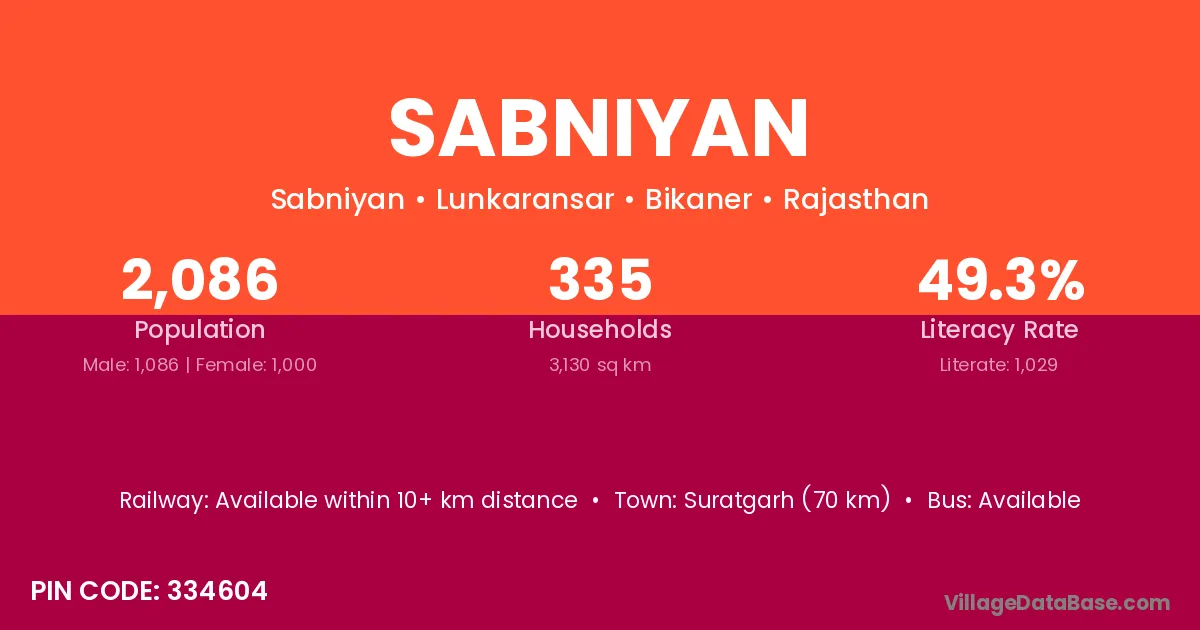 Suratgarh (70 km) is the nearest town to Sabniyan village for major economic activities and is located approximately 70 km away.