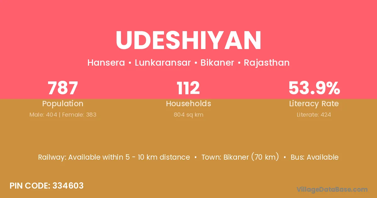 Bikaner (70 km) is the nearest town to Udeshiyan village for major economic activities and is located approximately 70 km away.