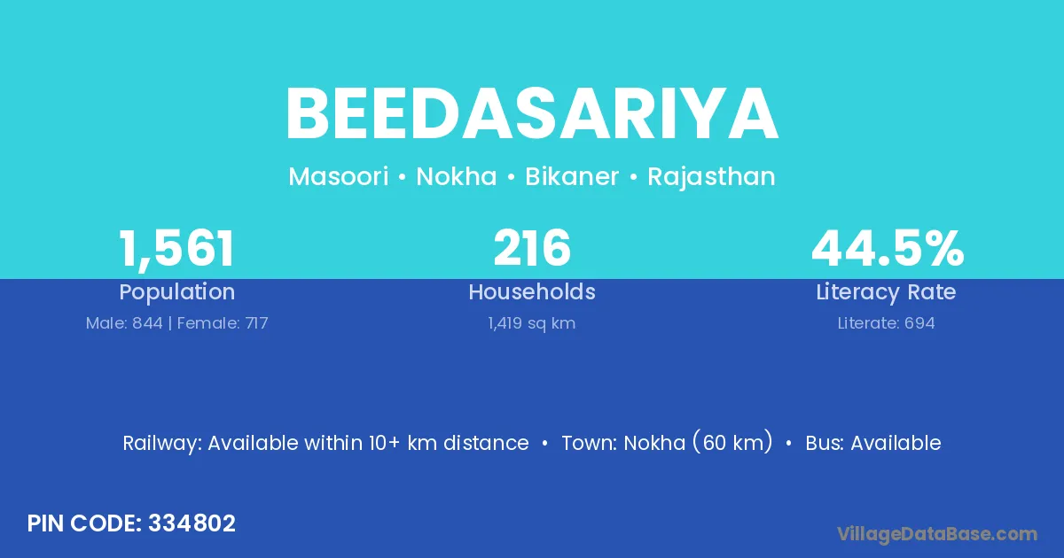 Nokha (60 km) is the nearest town to Beedasariya village for major economic activities and is located approximately 60 km away.