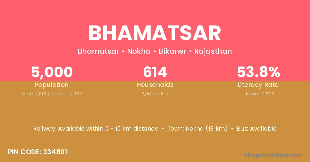 Nokha (18 km) is the nearest town to Bhamatsar village for major economic activities and is located approximately 18 km away.