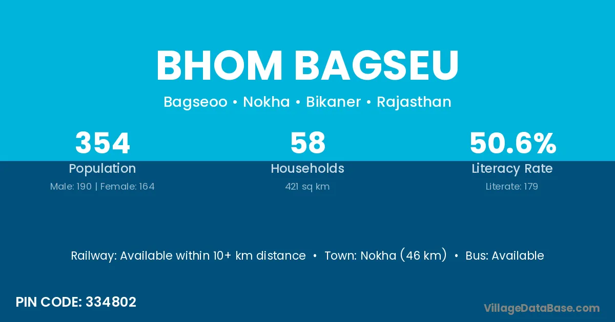 Nokha (46 km) is the nearest town to Bhom Bagseu village for major economic activities and is located approximately 46 km away.