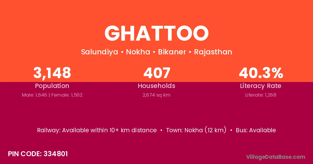 Nokha (12 km) is the nearest town to Ghattoo village for major economic activities and is located approximately 12 km away.