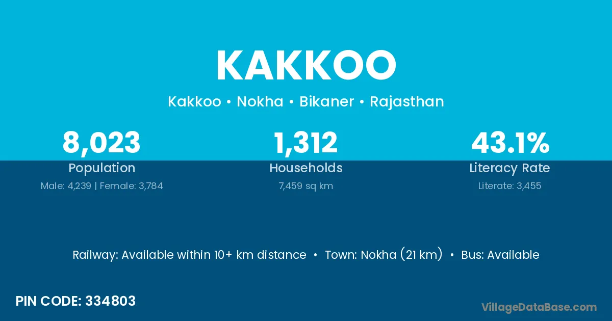 Nokha (21 km) is the nearest town to Kakkoo village for major economic activities and is located approximately 21 km away.