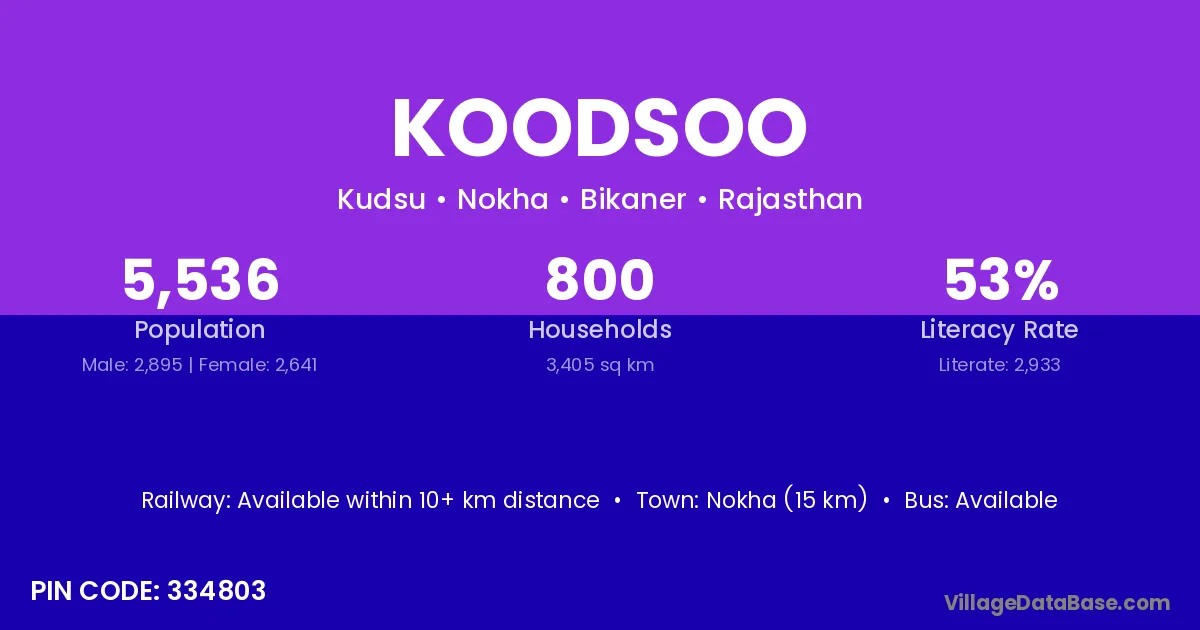Nokha (15 km) is the nearest town to Koodsoo village for major economic activities and is located approximately 15 km away.