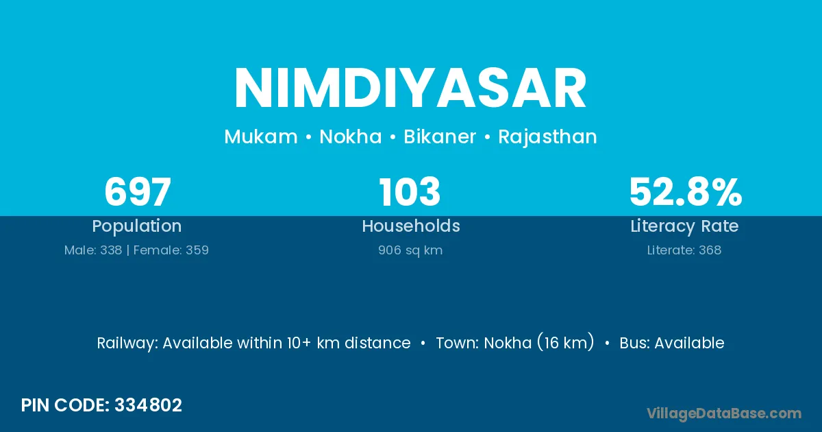 Nokha (16 km) is the nearest town to Nimdiyasar village for major economic activities and is located approximately 16 km away.
