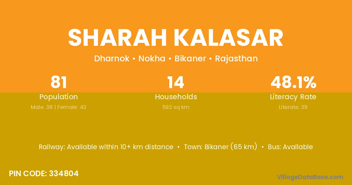 Bikaner (65 km) is the nearest town to Sharah Kalasar village for major economic activities and is located approximately 65 km away.