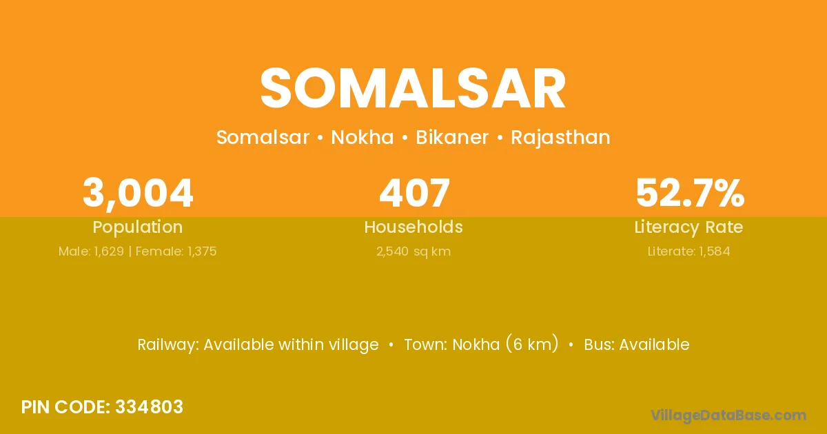 Nokha (6 km) is the nearest town to Somalsar village for major economic activities and is located approximately 6 km away.