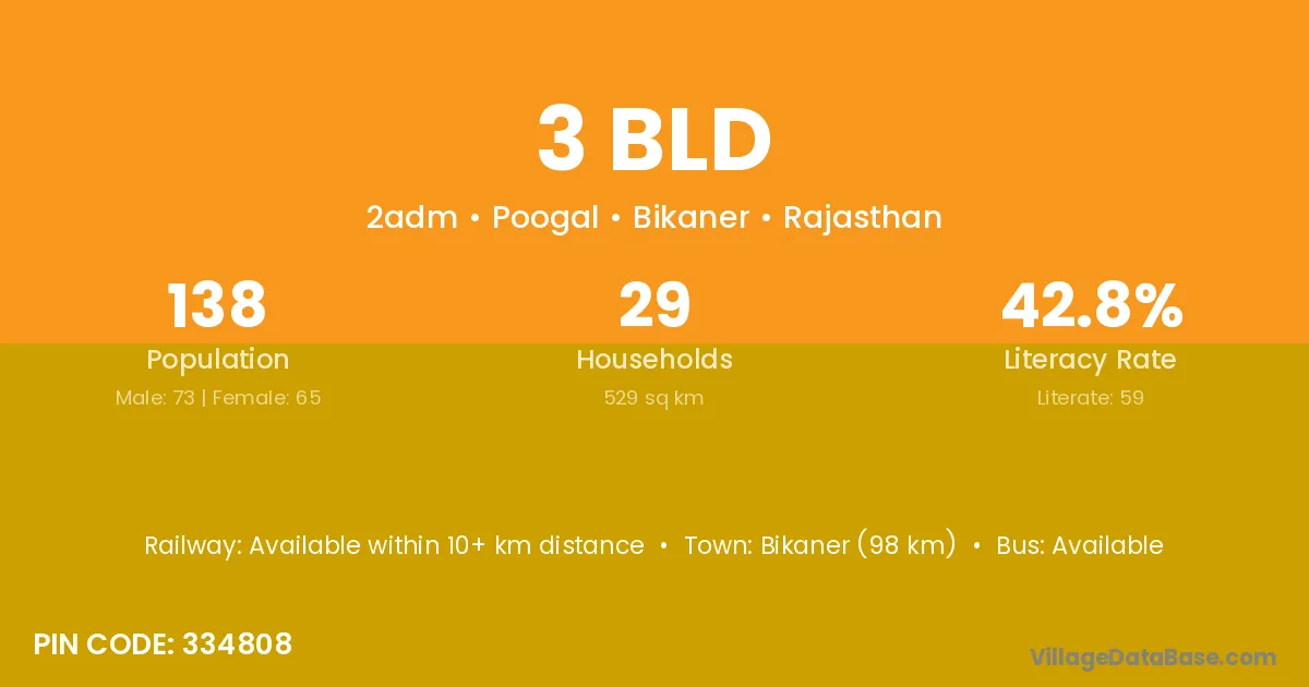 Bikaner (98 km) is the nearest town to 3 Bld village for major economic activities and is located approximately 98 km away.