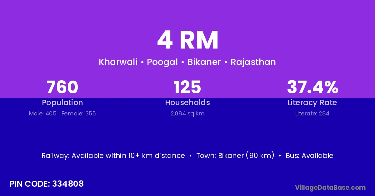 Bikaner (90 km) is the nearest town to 4 Rm village for major economic activities and is located approximately 90 km away.