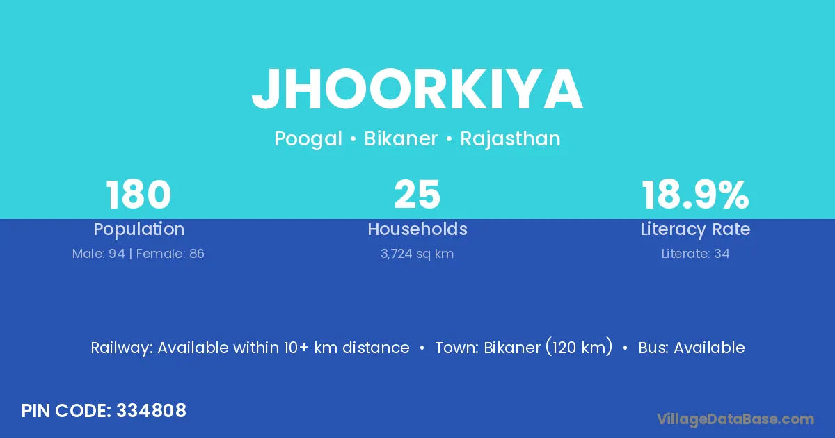 Bikaner (120 km) is the nearest town to Jhoorkiya village for major economic activities and is located approximately 120 km away.
