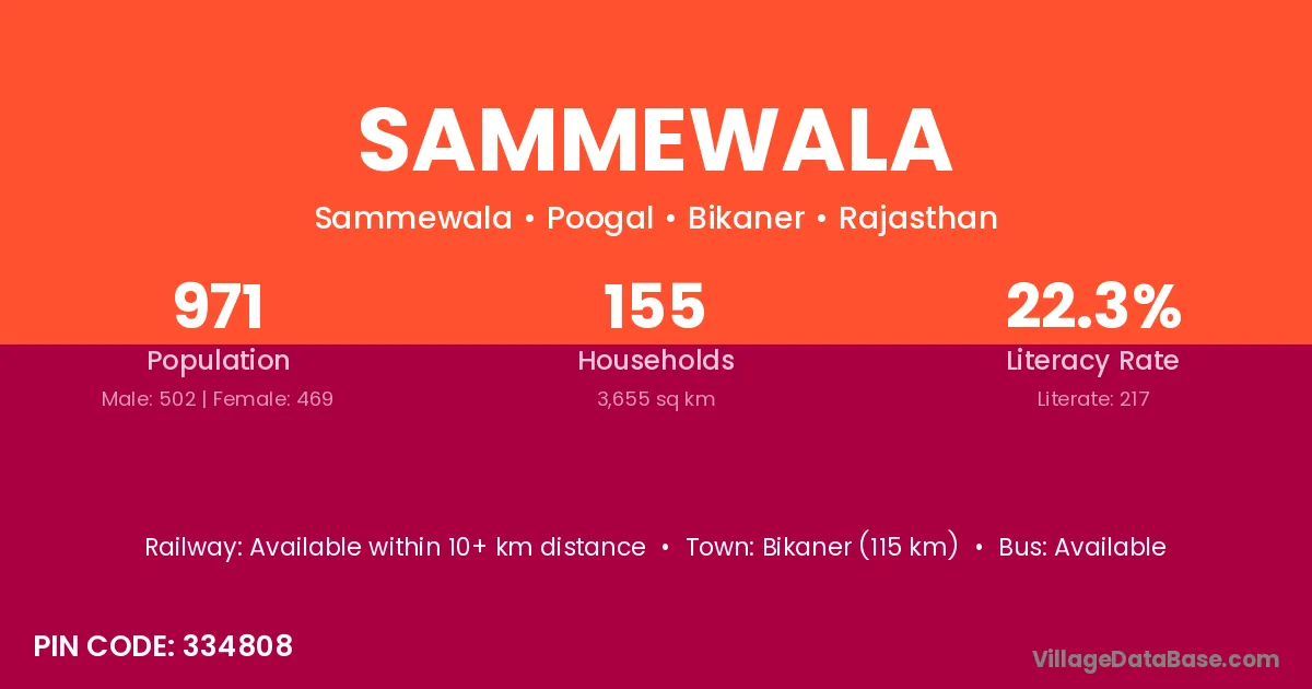 Sammewala village has a total population of 971 people, of which 502 are males and 469 are females.