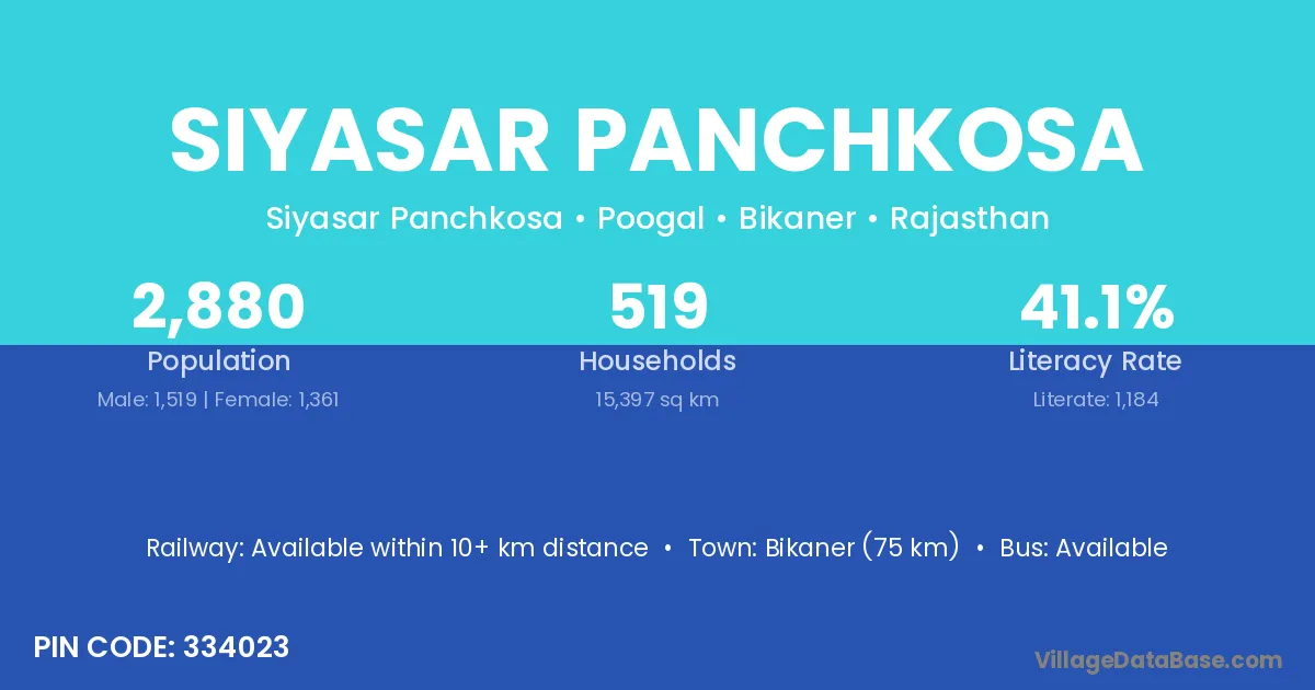 Bikaner (75 km) is the nearest town to Siyasar Panchkosa village for major economic activities and is located approximately 75 km away.