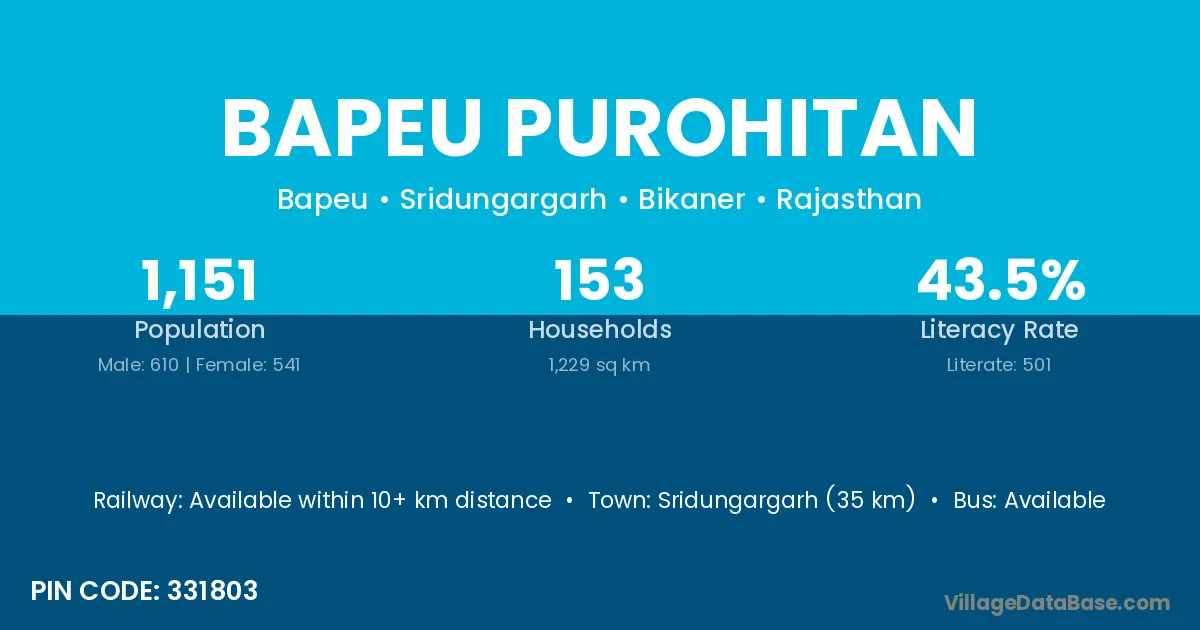 Sridungargarh (35 km) is the nearest town to Bapeu Purohitan village for major economic activities and is located approximately 35 km away.