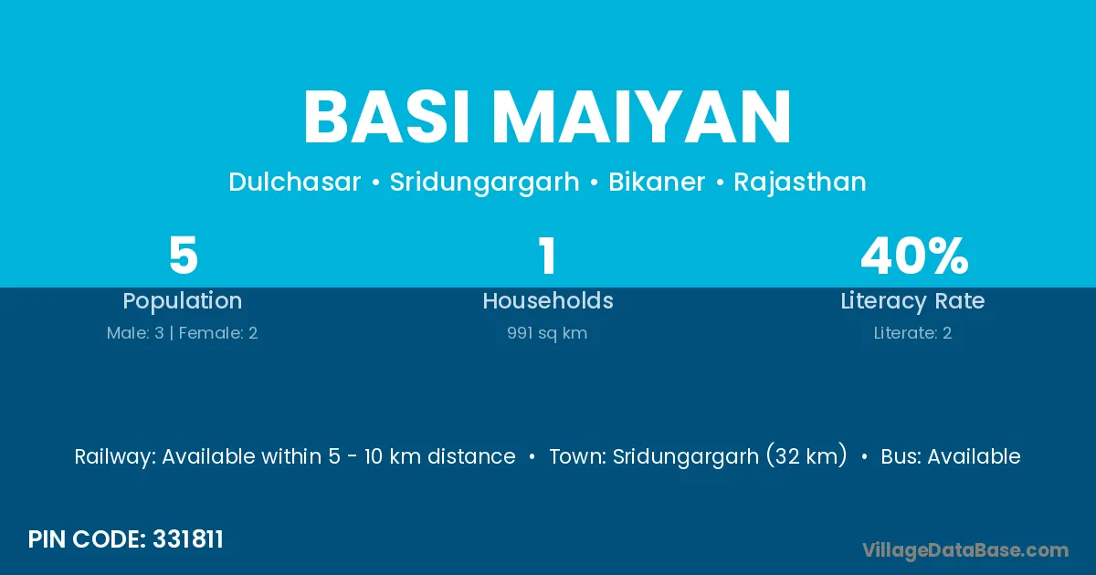 Sridungargarh (32 km) is the nearest town to Basi Maiyan village for major economic activities and is located approximately 32 km away.
