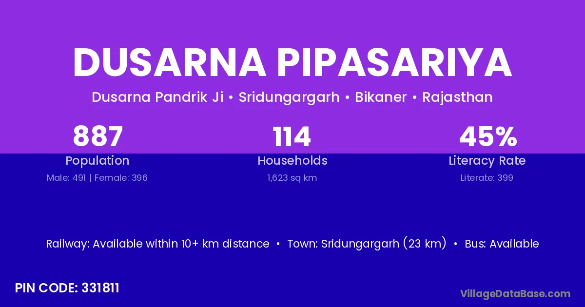 Sridungargarh (23 km) is the nearest town to Dusarna Pipasariya village for major economic activities and is located approximately 23 km away.