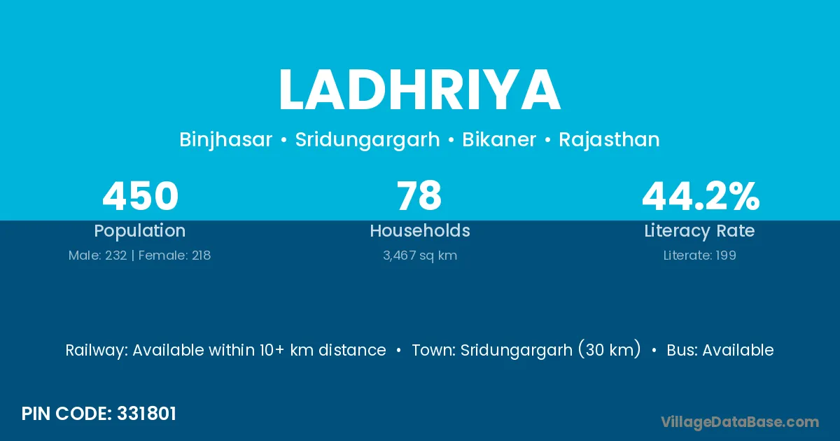Sridungargarh (30 km) is the nearest town to Ladhriya village for major economic activities and is located approximately 30 km away.