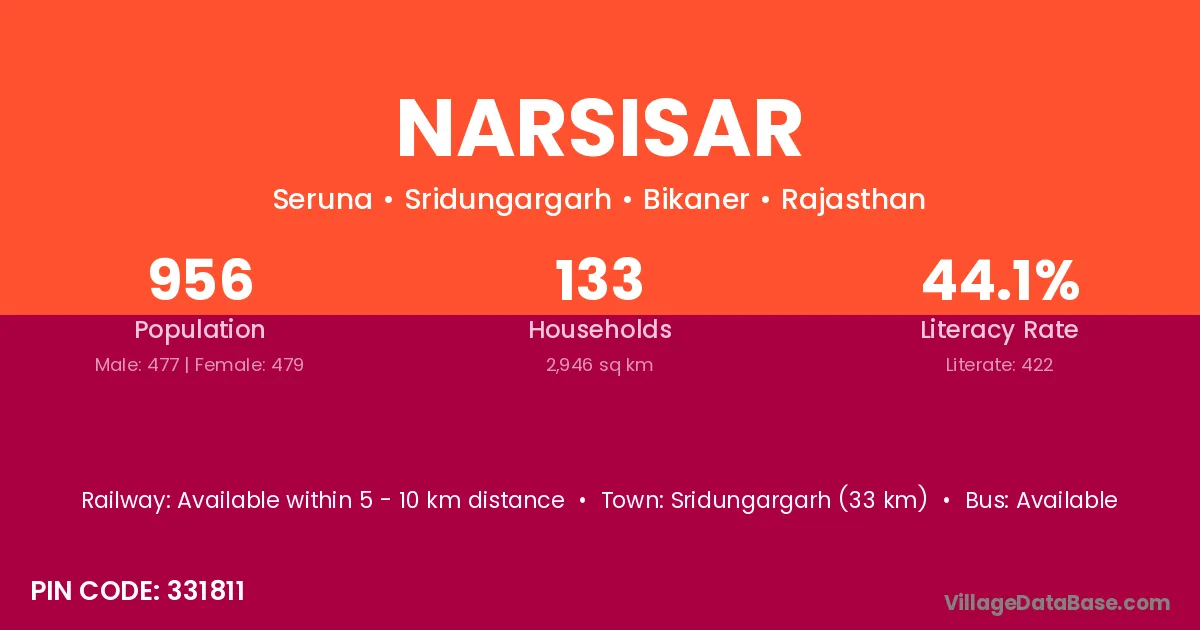 Sridungargarh (33 km) is the nearest town to Narsisar village for major economic activities and is located approximately 33 km away.