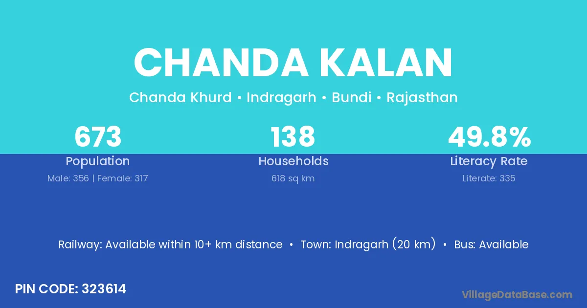 Indragarh (20 km) is the nearest town to Chanda Kalan village for major economic activities and is located approximately 20 km away.