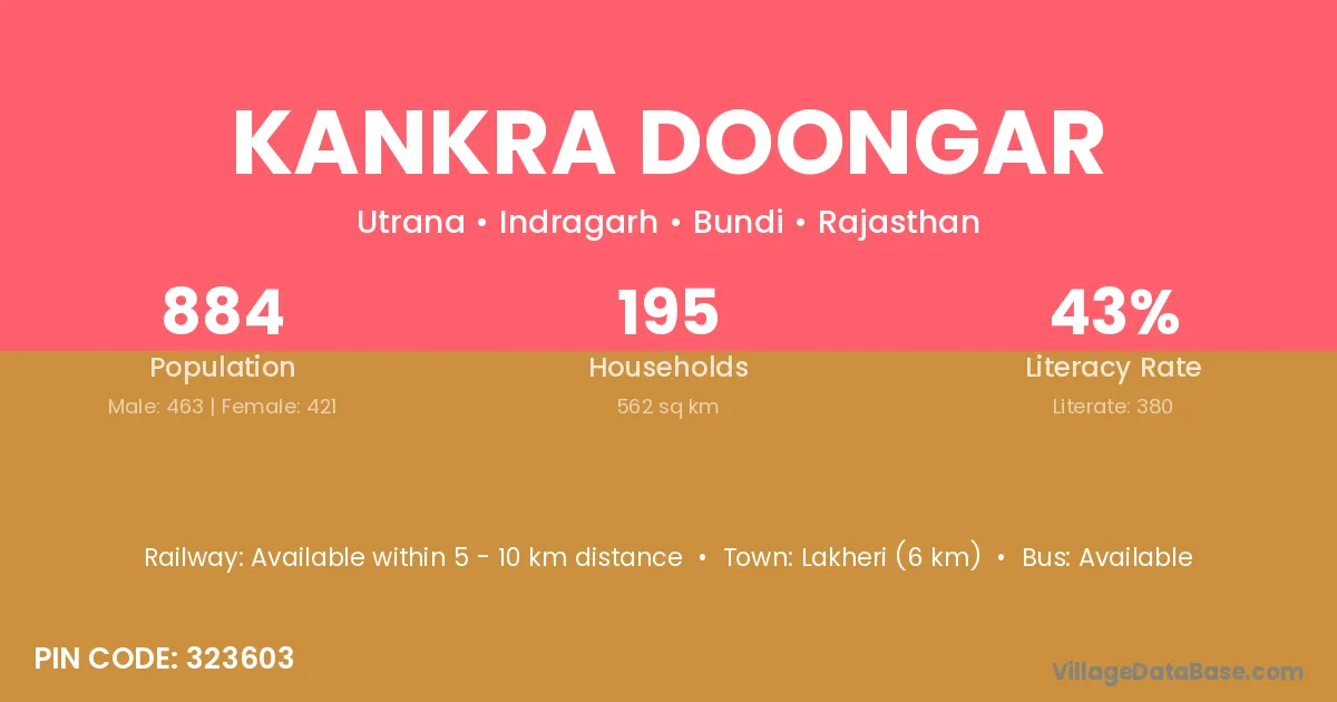Lakheri (6 km) is the nearest town to Kankra Doongar village for major economic activities and is located approximately 6 km away.