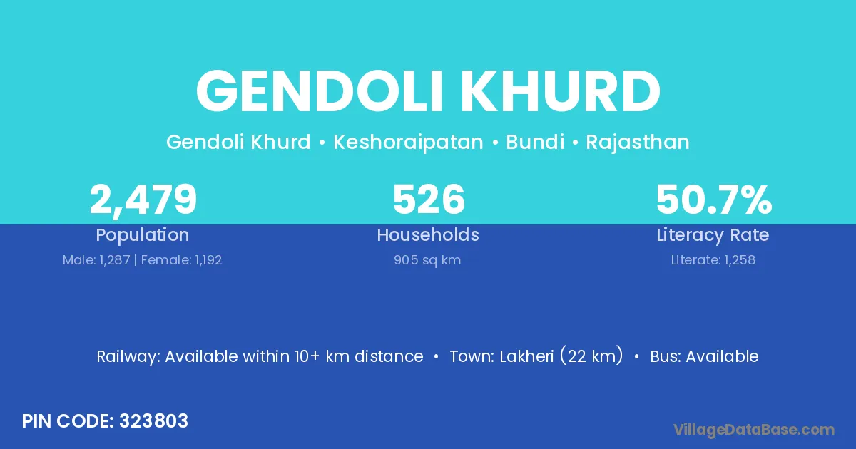 Lakheri (22 km) is the nearest town to Gendoli Khurd village for major economic activities and is located approximately 22 km away.