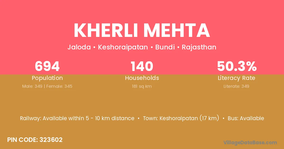 Keshoraipatan (17 km) is the nearest town to Kherli Mehta village for major economic activities and is located approximately 17 km away.