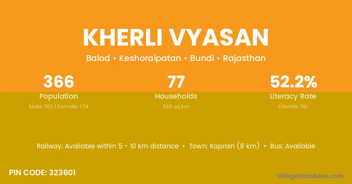 Kherli Vyasan village has a total population of 366 people, of which 192 are males and 174 are females.
