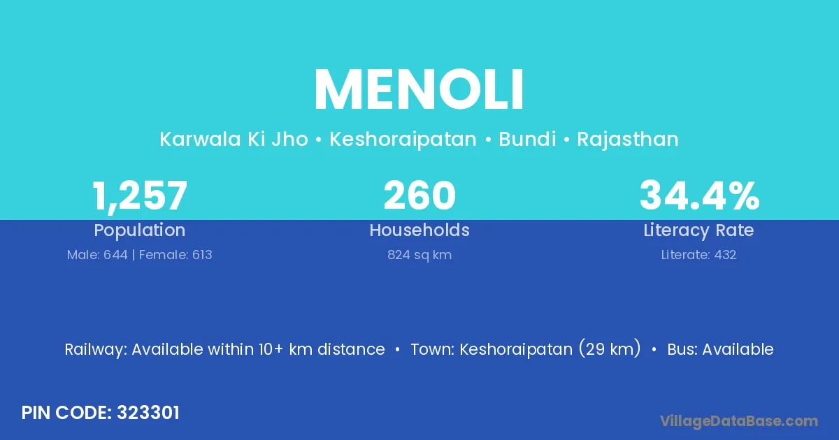 Keshoraipatan (29 km) is the nearest town to Menoli village for major economic activities and is located approximately 29 km away.