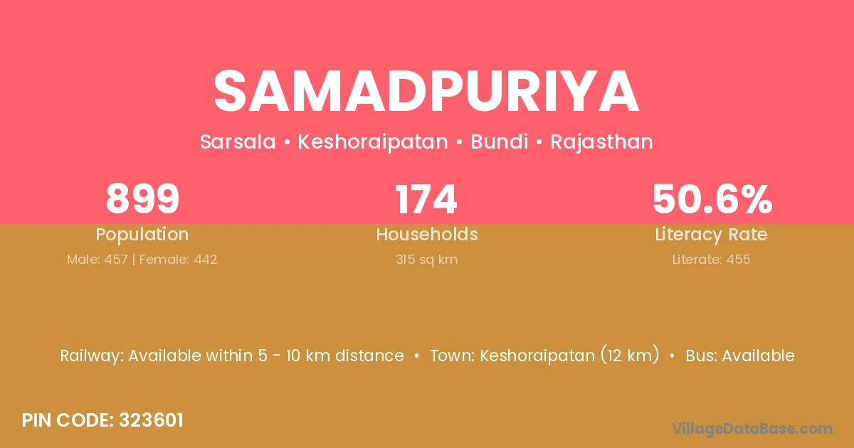 Keshoraipatan (12 km) is the nearest town to Samadpuriya village for major economic activities and is located approximately 12 km away.