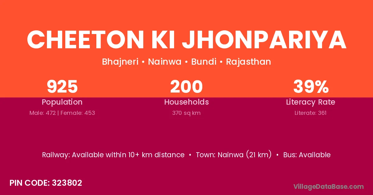 Cheeton Ki Jhonpariya village has a total population of 925 people, of which 472 are males and 453 are females.