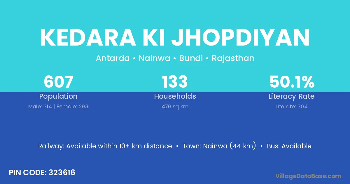 Kedara Ki Jhopdiyan village has a total population of 607 people, of which 314 are males and 293 are females.