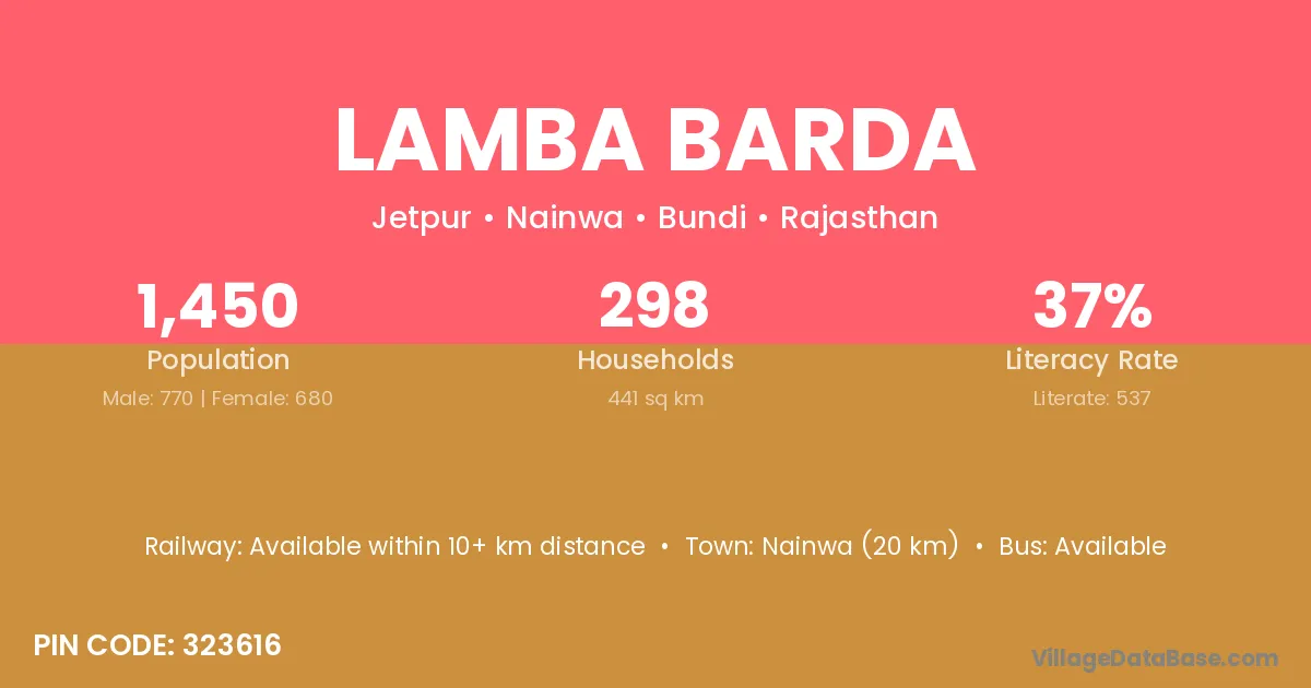Nainwa (20 km) is the nearest town to Lamba Barda village for major economic activities and is located approximately 20 km away.