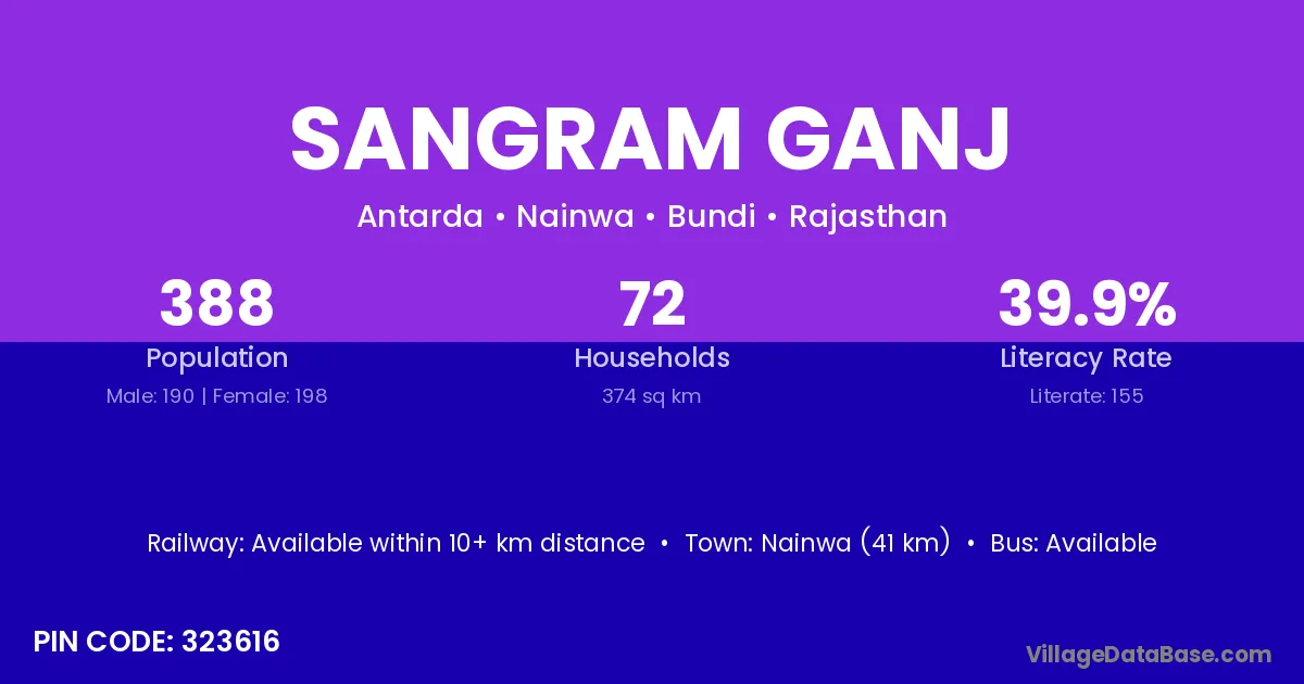 Nainwa (41 km) is the nearest town to Sangram Ganj village for major economic activities and is located approximately 41 km away.