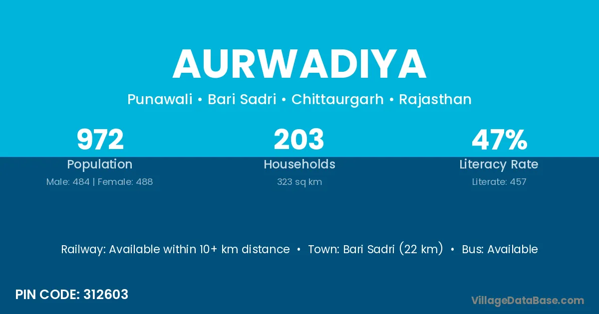 Bari Sadri (22 km) is the nearest town to Aurwadiya village for major economic activities and is located approximately 22 km away.