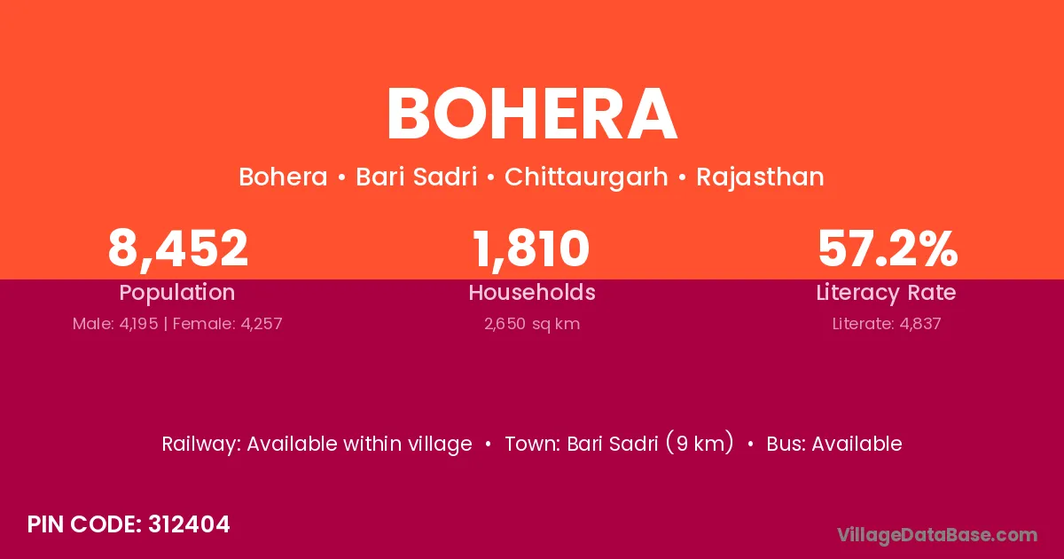 Bari Sadri (9 km) is the nearest town to Bohera village for major economic activities and is located approximately 9 km away.
