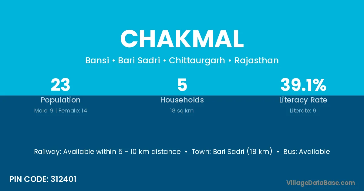 Bari Sadri (18 km) is the nearest town to Chakmal village for major economic activities and is located approximately 18 km away.