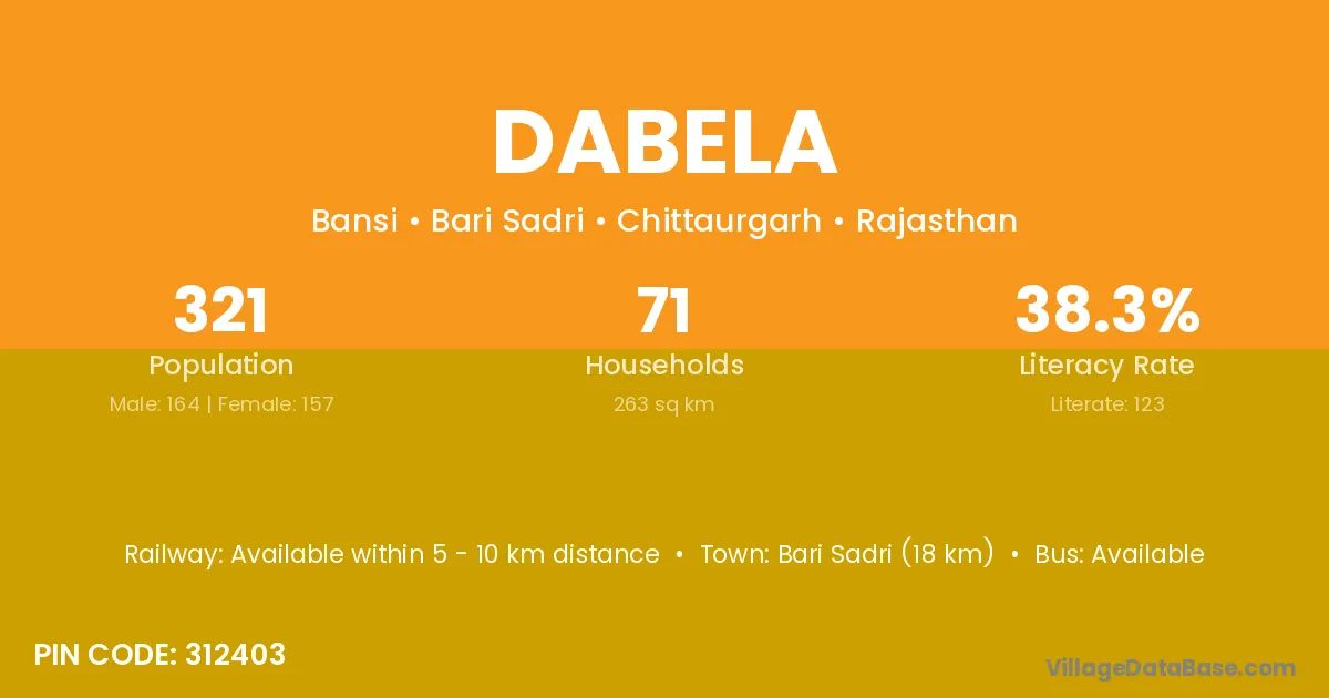 Bari Sadri (18 km) is the nearest town to Dabela village for major economic activities and is located approximately 18 km away.