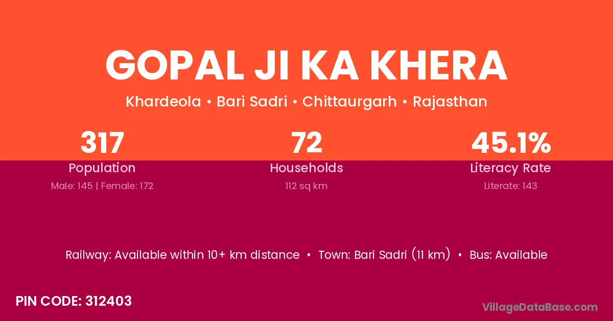 Bari Sadri (11 km) is the nearest town to Gopal Ji Ka Khera village for major economic activities and is located approximately 11 km away.