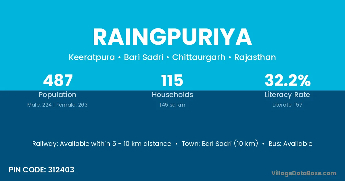 Bari Sadri (10 km) is the nearest town to Raingpuriya village for major economic activities and is located approximately 10 km away.