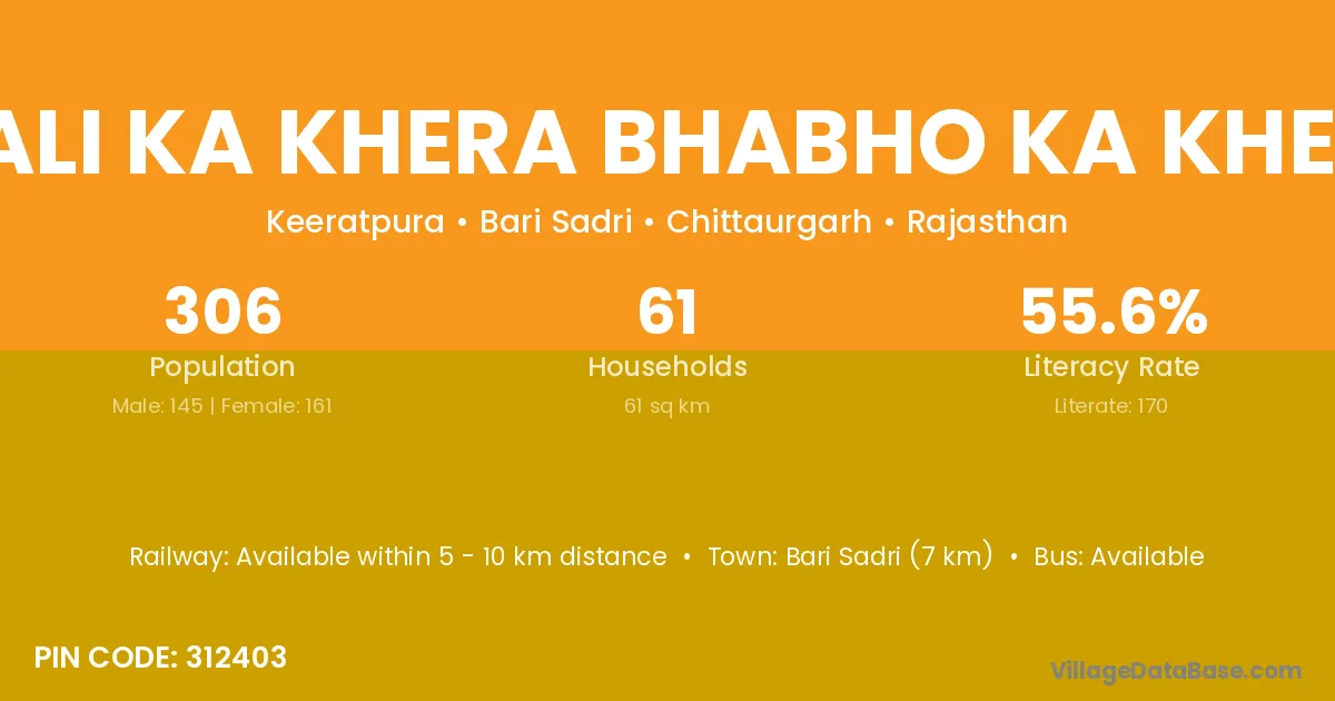 Wali Ka Khera Bhabho Ka Khera village has a total population of 306 people, of which 145 are males and 161 are females.