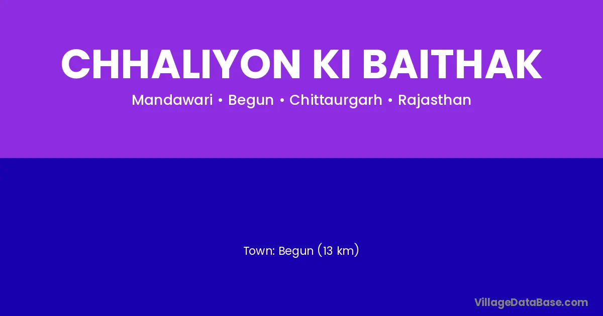 Begun (13 km) is the nearest town to Chhaliyon Ki Baithak village for major economic activities and is located approximately 13 km away.