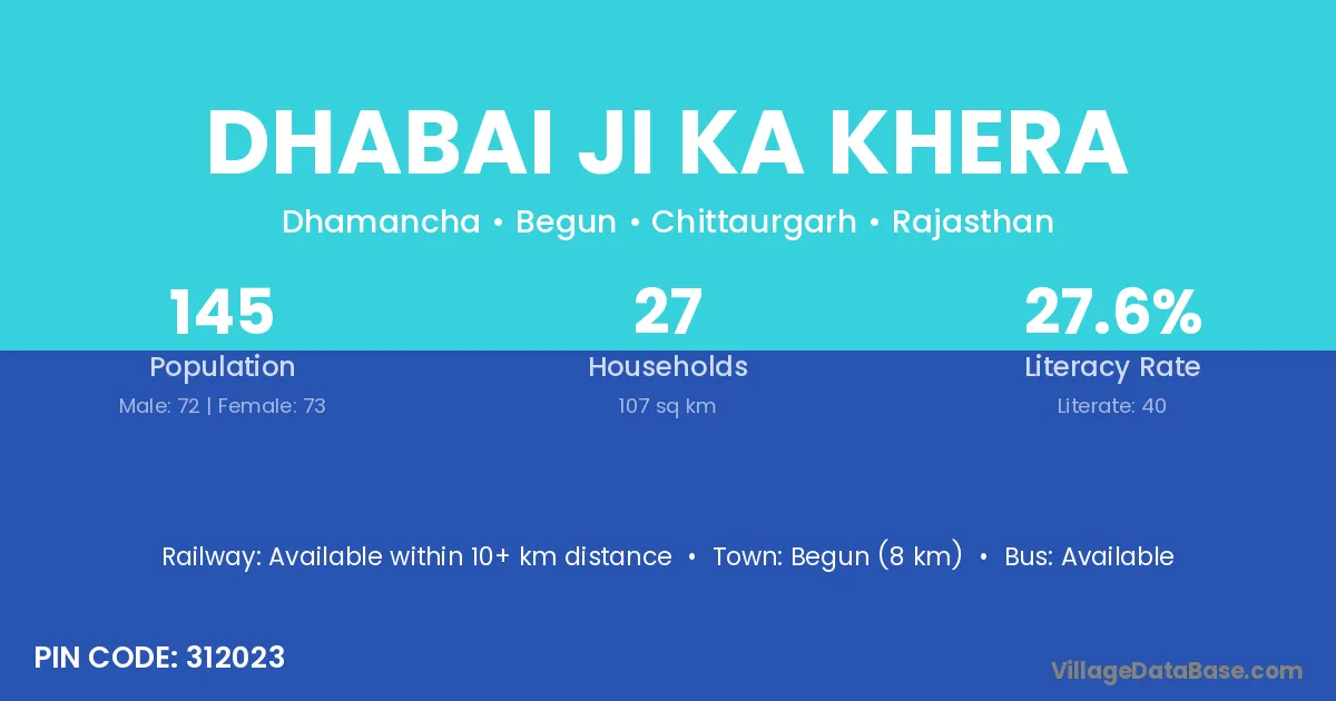 Begun (8 km) is the nearest town to Dhabai Ji Ka Khera village for major economic activities and is located approximately 8 km away.