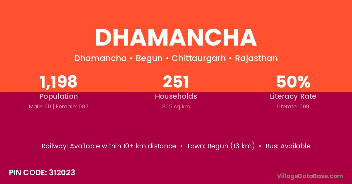 Dhamancha village has a total population of 1,198 people, of which 611 are males and 587 are females.