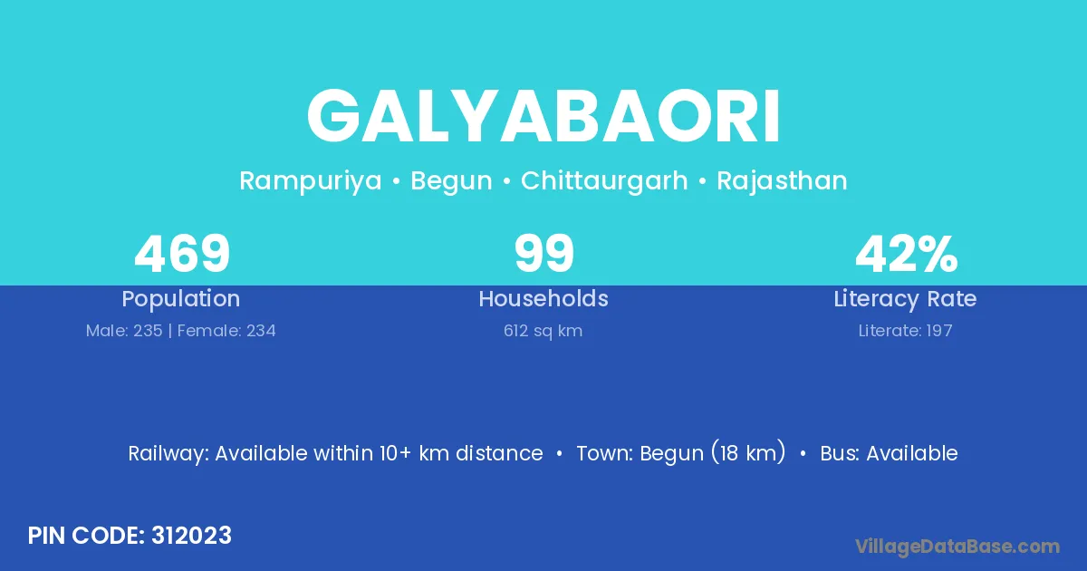 Begun (18 km) is the nearest town to Galyabaori village for major economic activities and is located approximately 18 km away.