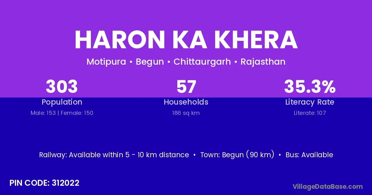 Haron Ka Khera village has a total population of 303 people, of which 153 are males and 150 are females.