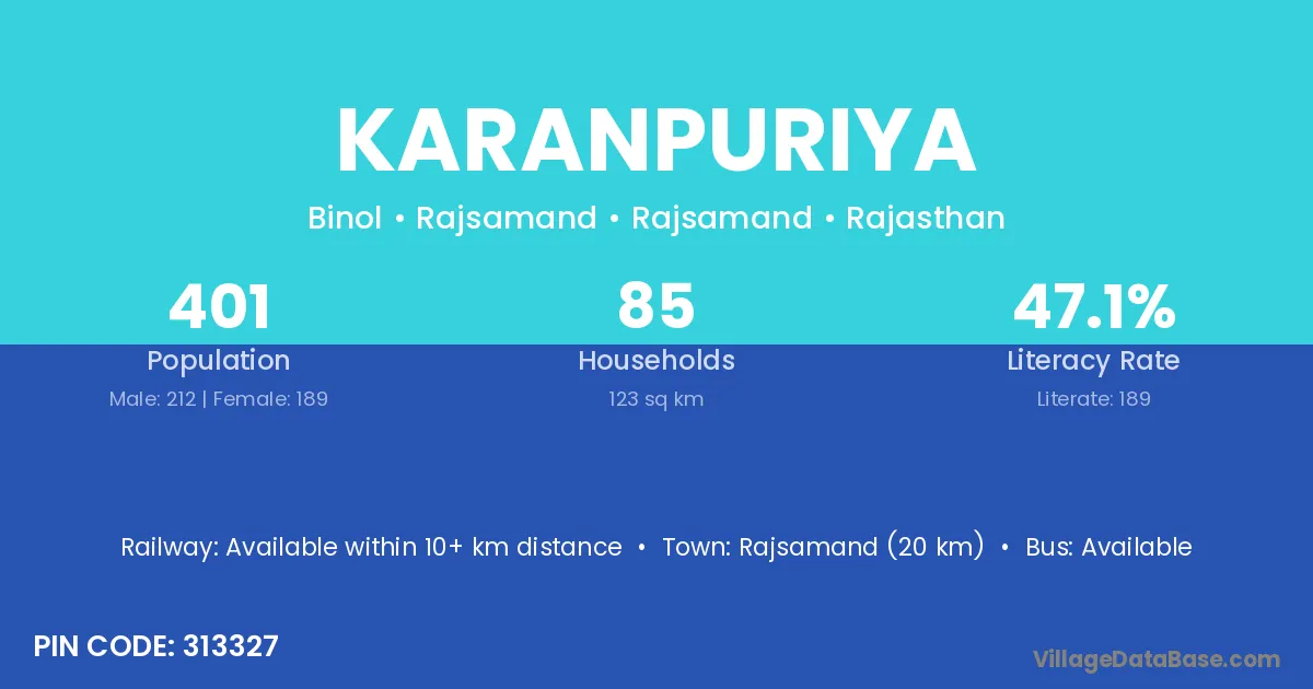 Begun (18 km) is the nearest town to Karanpuriya village for major economic activities and is located approximately 18 km away.
