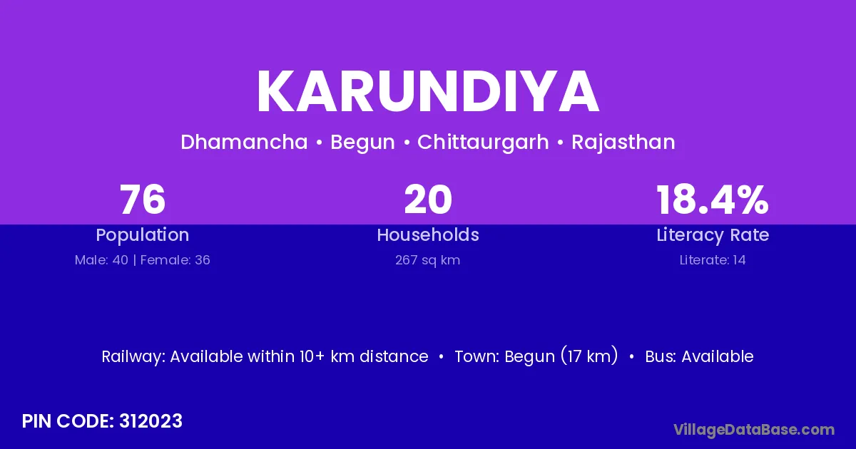 Begun (17 km) is the nearest town to Karundiya village for major economic activities and is located approximately 17 km away.